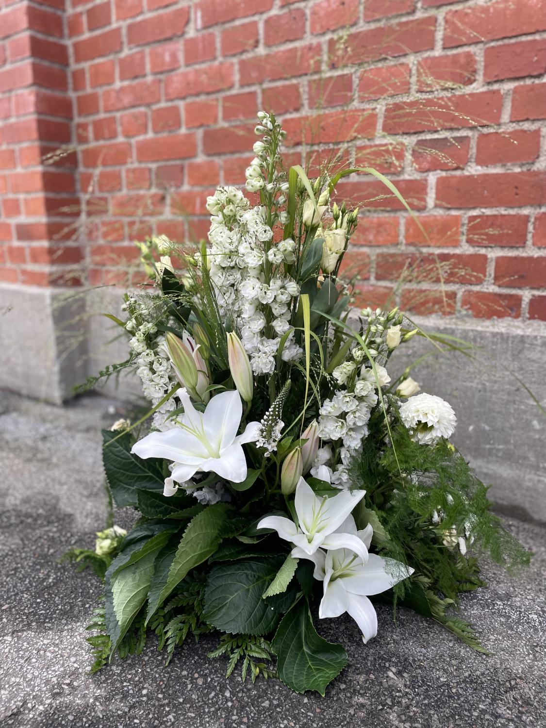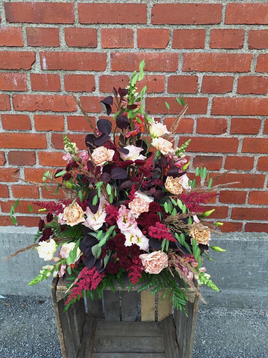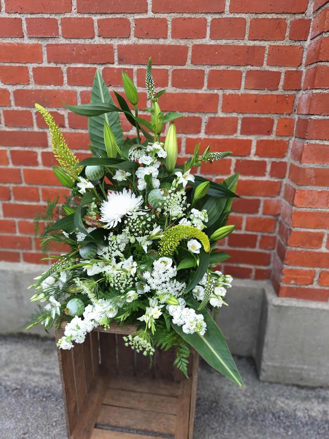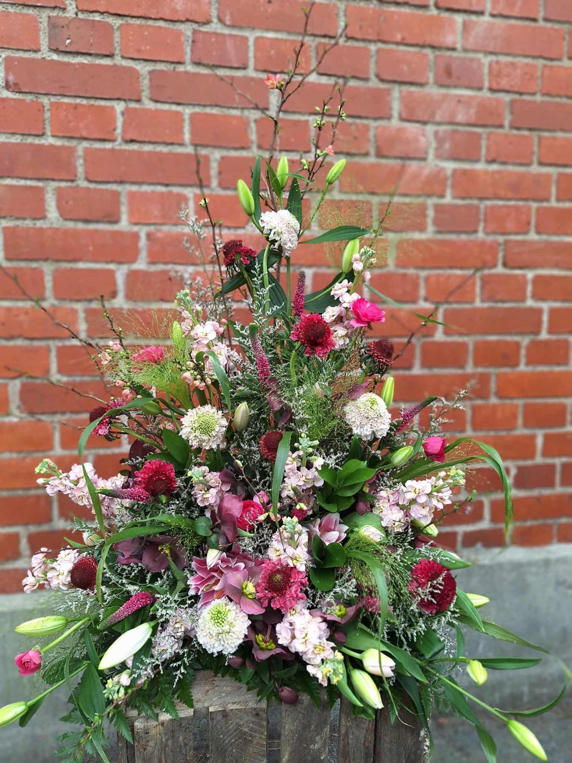 Du väljer en färg som kommer bli huvudfärgen i dekorationen. Vi fyller på med blommor i samma nyanser och toner som vi tycker passar. De sorters blommor vi använder varierar efter säsong och tillgång. Bilderna som visas är endast ett bildexempel på hur en hög dekoration kan se ut men vi eftersträvar alltid att göra så stora, fylliga och vackra dekorationer som möjligt.
