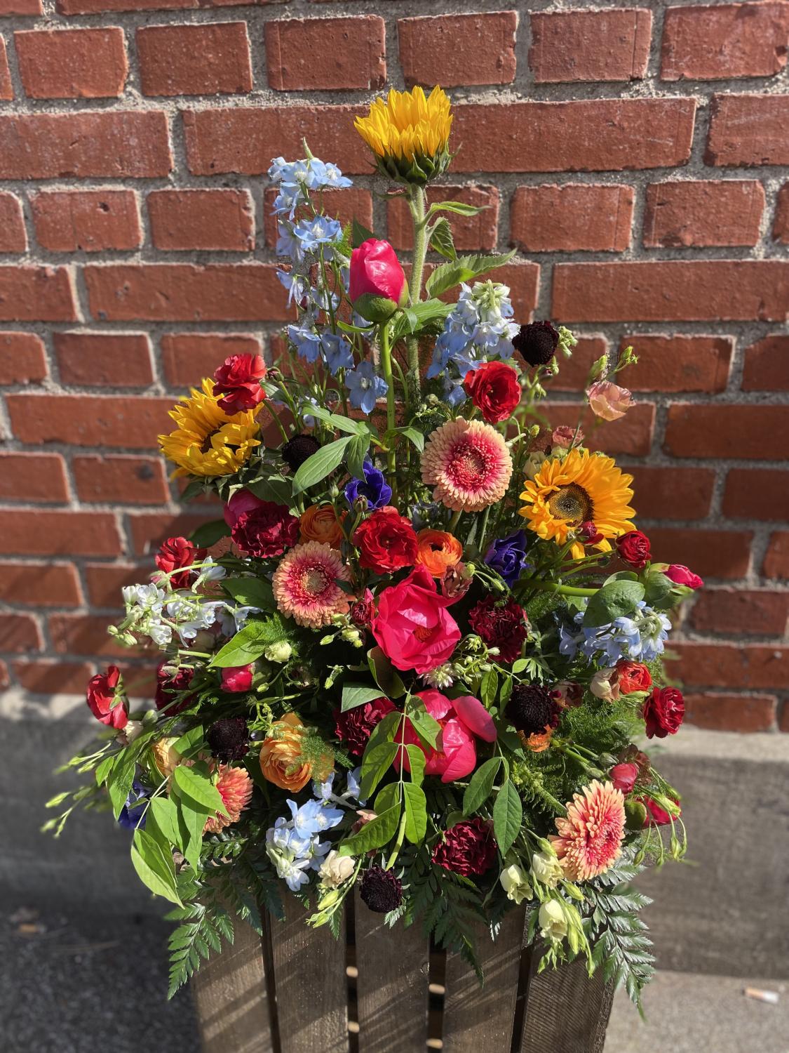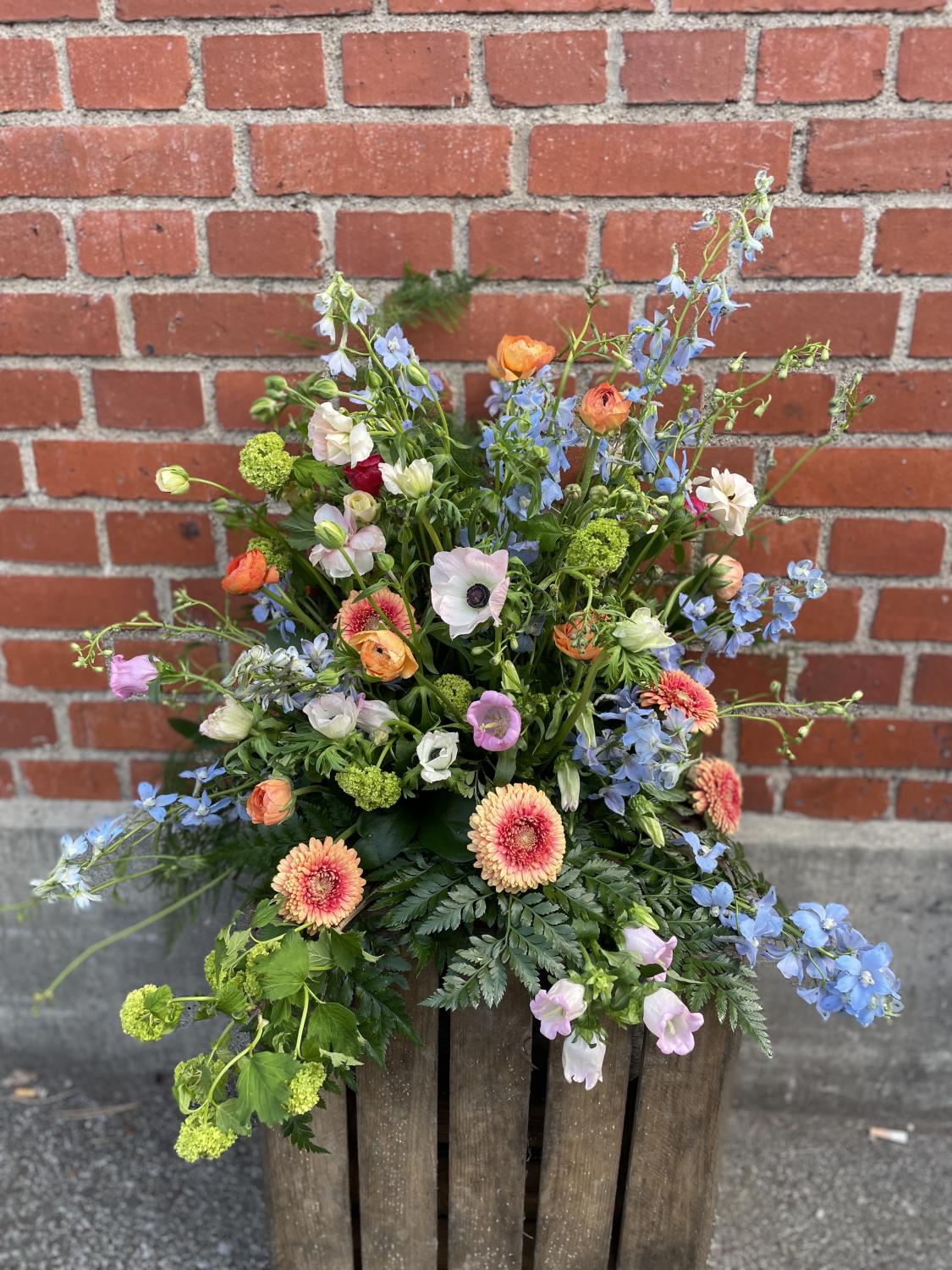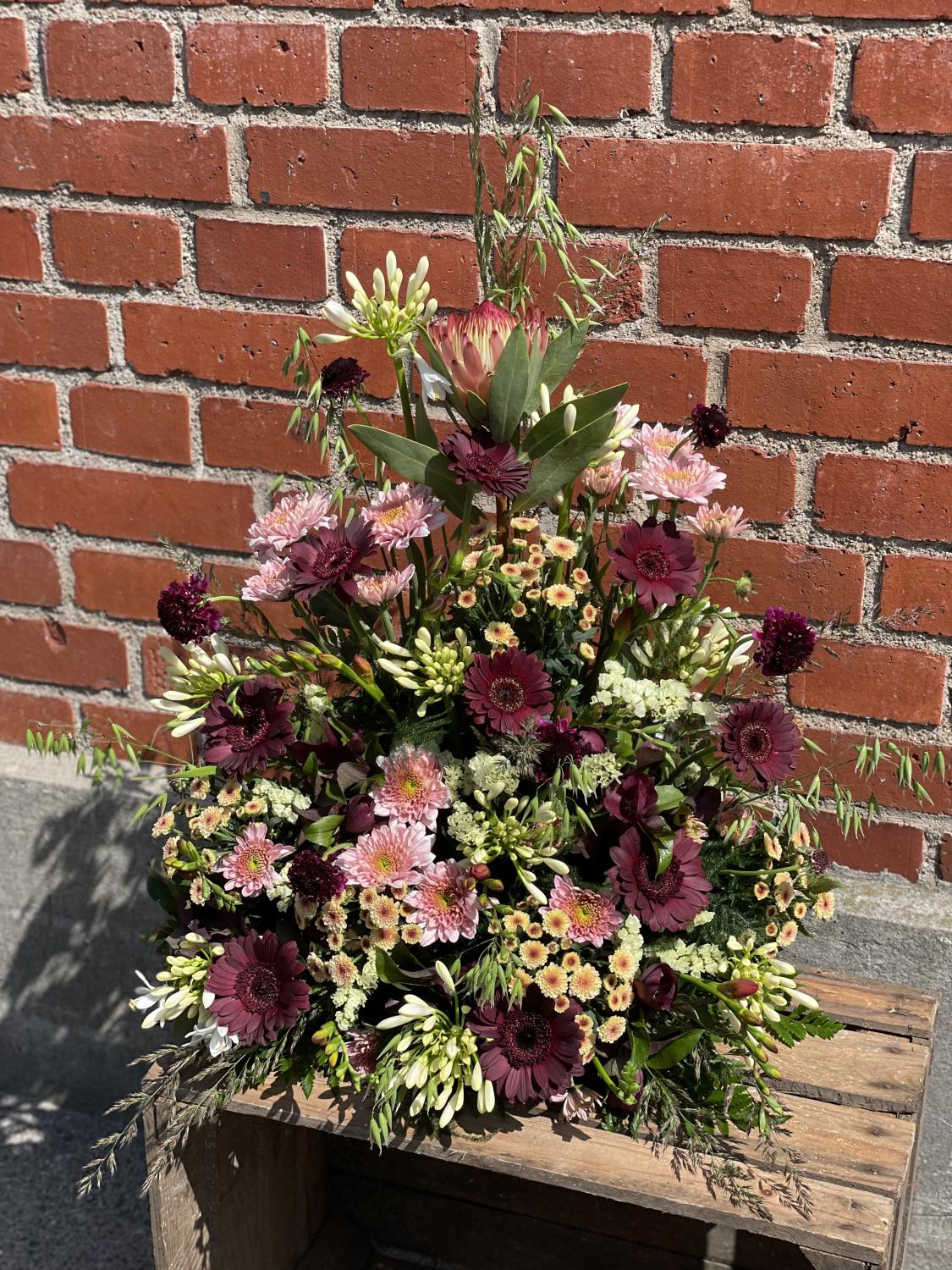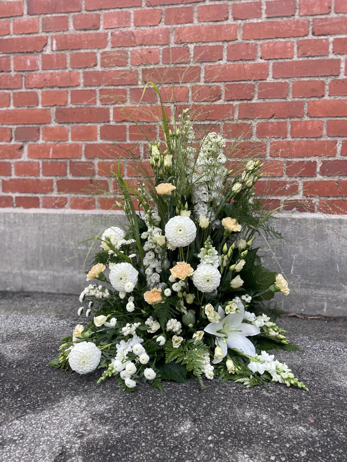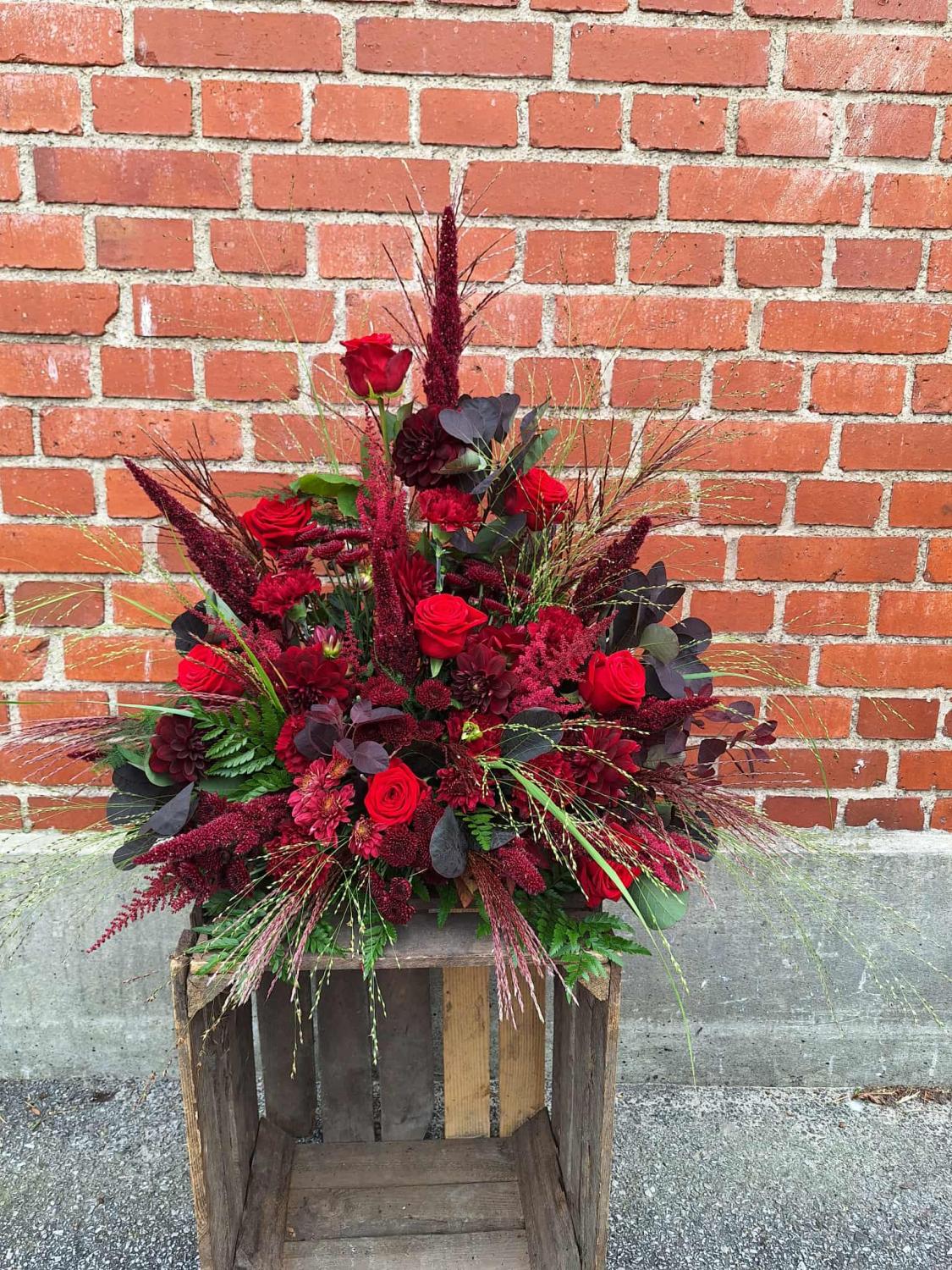 Du väljer en färg som kommer bli huvudfärgen i dekorationen. Vi fyller på med blommor i samma nyanser och toner som vi tycker passar. De sorters blommor vi använder varierar efter säsong och tillgång. Bilderna som visas är endast ett bildexempel på hur en hög dekoration kan se ut men vi eftersträvar alltid att göra så stora, fylliga och vackra dekorationer som möjligt.